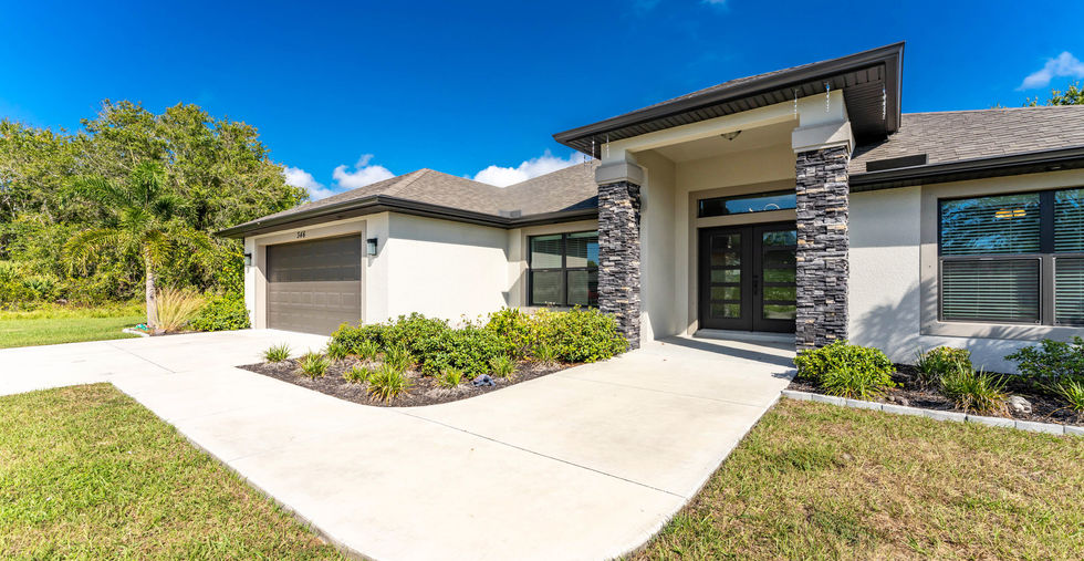 Built in 2022, stroll into this stunning home from the wide front side walk and large covered front entry which offers the charm of brand-new construction while being perfectly tucked away at the end of a cul-de-sac in the highly sought-after Deep Creek community. With over 1,800 square feet of living space, there’s plenty of room to entertain family and friends in style. Elegant custom finishes are found throughout — including custom impact rated 5 panel glass double main entry doors, trey ceilings, hard-surface countertops, tile flooring, and custom lighting — setting this home apart from others on the market. Laundry room access through to the garage features stainless feel front loading washer and dryer both on pedestal drawers for added storage plus sink and cabinetry features. Enjoy the spacious layout featuring a separate den with French glass doors, high ceilings, with a BUYER BONUS of multiple large flat-screen TVs with mounts already in place, perfect for Sunday night football. The master suite offers dual walk-in closets, dual sinks, a luxurious walk-in shower, and private access to the screened lanai. The split-bedroom floor plan provides privacy and functionality, complemented by an open kitchen and great room. The kitchen features a large eat-in island, separate dining area, pantry, stainless steel appliances, and abundant cabinet space. The air-conditioned two-car garage with epoxy flooring is ideal for keeping your vintage car or prized possessions protected from the Florida heat. Deep Creek is a deed-restricted community with low annual HOA dues of just $200 and access to exceptional amenities — including a community park, sidewalks, tennis and pickleball courts, basketball court, playground, and a scenic golf course — perfect for an active lifestyle. Conveniently located near I-75, Walmart, Publix, shopping, dining, and medical centers, plus beautiful Florida beaches are not but a quick drive away.